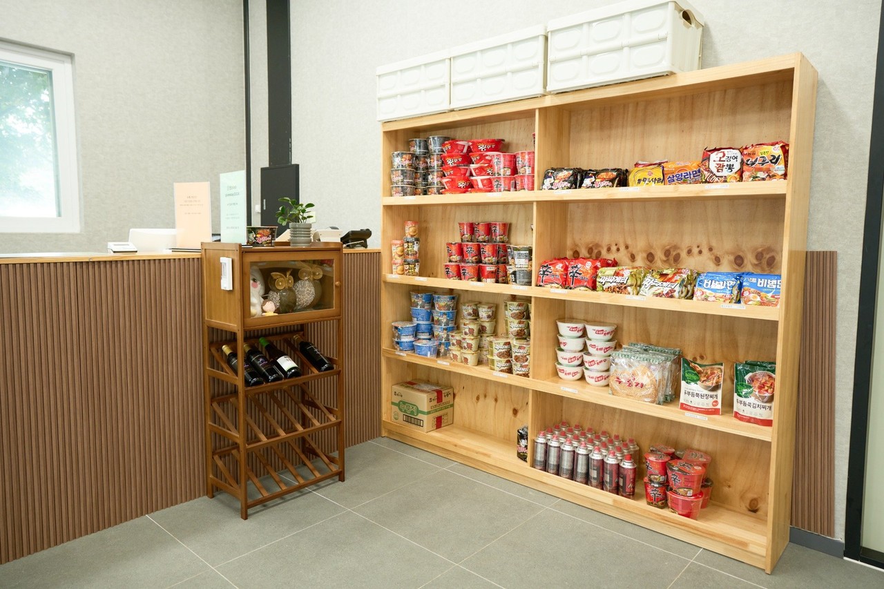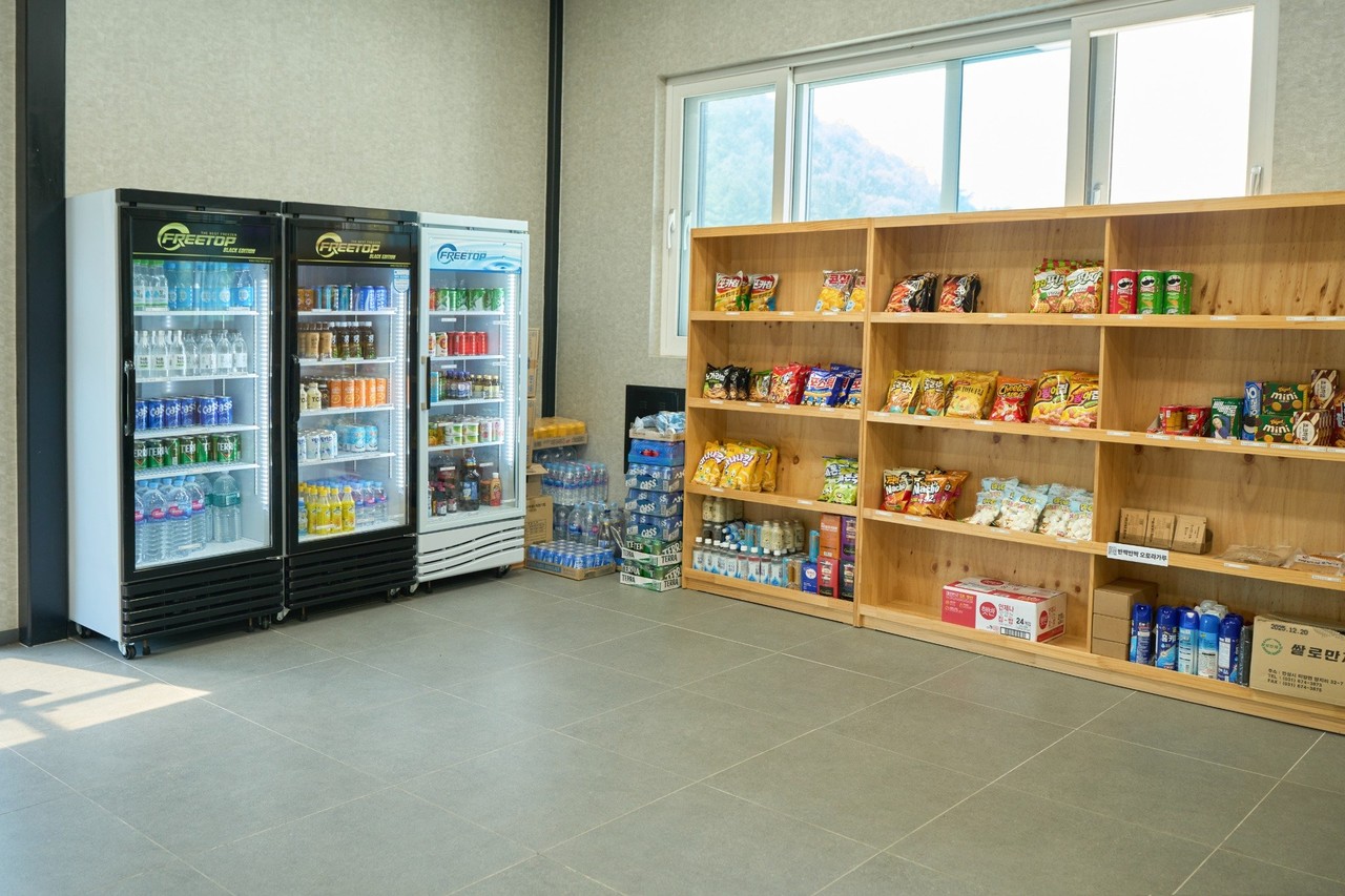 다양한 스낵과 음료가 있는 글램스테이 매점
